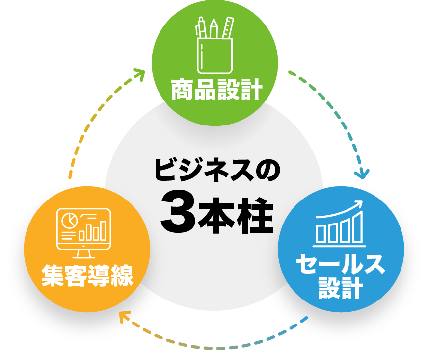 その中でも最も重要なのが、「商品設計」「集客導線」「セールス設計」の3つです。